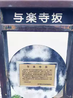 The name of the slope originates from Yorakuji Temple located at the bottom of the slope. According to the "Tokyo Prefecture Village Records," it is described as "located northwest of Yorakuji Temple, descending southward, with a length of 25 ken and a width of 1 ken and 3 shaku." Near this slope lived painter Sentaro Iwata, lacquer artist Yang Cheng, metal artist Hideaki Katori, and writer Ryunosuke Akutagawa.