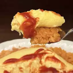 The soft sweetness of the eggs, the richness of the rice, and the special ketchup sauce blend perfectly, creating a flavor that makes you want to eat it again and again.