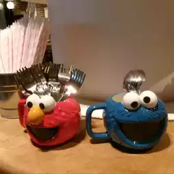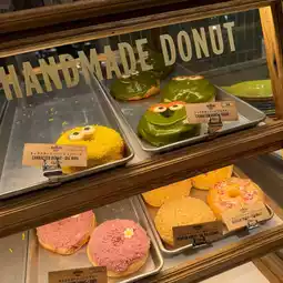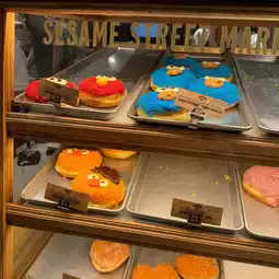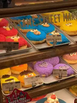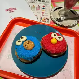 Let's go to Sesame Street Cafe 🍩✨ Yesterday, Bew reviewed Sesame Street Market. Right next to it, there's also a cafe‼️ It's so cute that I almost don't want to eat it🥹 As for what Bew ordered, it was Elmo-shaped donuts❤️ in Raspberry flavor and Cookies Monster💙 shaped donuts in Sugar flavor 🍩 priced at 520¥ each. For the drink, Bew ordered peach soda 🍑 even though I don't like peach at all 55555, but I ordered it just because of the color and Abby design, priced at 950¥😂 Actually, both the donuts and drinks come in other characters and flavors too. For example, Oscar-shaped donuts are Matcha flavor, and Lemon Soda is BigBird (I'll post the menu in the comments). Whoever likes any character or color, or wants to order any flavor for content, feel free🤏🏻