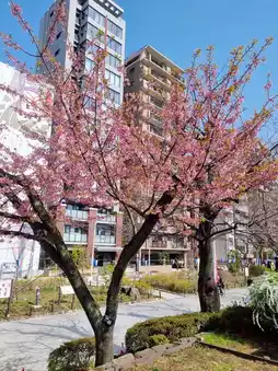 ✨ Both sides of the path are lined with large trees, especially beautiful cherry blossoms in full bloom during spring along the entire walkway.