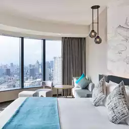 In the evening, the setting sun dyes the entire room golden. Watching the beautiful scenery change with the time of day, later enjoying the bustling city with a drink 🥃 while savoring the healing night view through the floor-to-ceiling window.