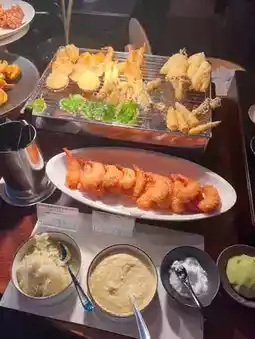 The sushi and tempura are made fresh on-site, watching the chef hand-press the sushi! On this day, there were about 8 types of sushi, plus mini seafood bowls served in cups. The tempura is especially great—the fried shrimp is deliciously bouncy, and they also have my favorite maitake mushroom tempura. I also recommend the grilled beef.