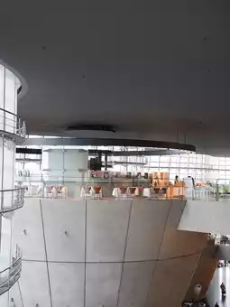 The architecture itself is striking, with a wave-like exterior and a spacious, airy interior that feels open and inviting.