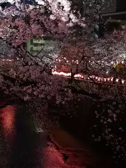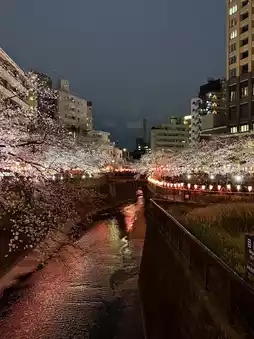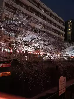 Meguro River is a must-visit cherry blossom spot. When I traveled with my parents in April, we caught the early blossoms. After dark, the pink cherry blossoms under the lights were absolutely stunning.