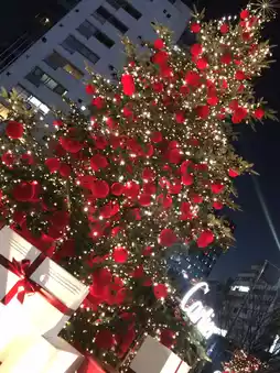 Don't miss the giant Christmas trees in front of brand-name shops. The red and gold ornaments stand out against the night sky, creating a scene straight out of a movie.