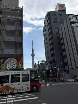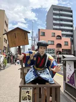 The entrance to the temple is surrounded by shops on all sides, including kimono rental stores where you can rent a kimono to wear for temple visits or photo shoots in Tokyo. The area is quite crowded, and the weather can be hot 🥵 with occasional rain. Along the streets and shops, you'll find statues of various characters, adding a distinctly Japanese vibe. Additionally, there are rickshaw services available for touring around the city. From the front of the temple, you can enjoy a perfect view of the Tokyo Skytree.