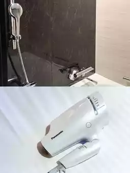 The spacious public bath features a mist sauna, shower head, and hair dryer.