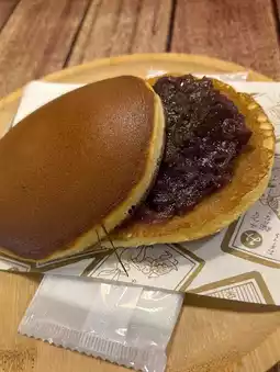 In addition to the monaka, the Sugamo branch also specializes in freshly made dorayaki! The three flavors are "Ogura red bean paste," "white bean paste," and "green bean paste." From the entrance, you can watch the chef making the dorayaki wrappers! I walked into the shop and bought a freshly made dorayaki. They also had hot and iced tea available. It was a great way to relax and savor the freshly made dorayaki – the perfect way to relax and unwind on your own!