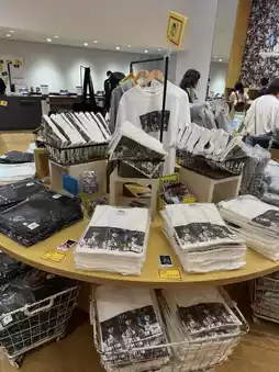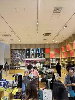 The spacious shop is lined with a wide selection of merchandise, including apparel, tote bags, postcards, acrylic stands, stickers, and more. ✨