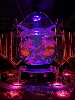 Watching the vibrantly illuminated goldfish swimming in the darkness feels like you've been transported to a dream.