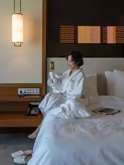 The room is spacious at 50㎡! It features a king-size bed, a desk, and even a sofa by the window, making it the perfect place to relax and unwind. It was absolutely amazing😍