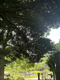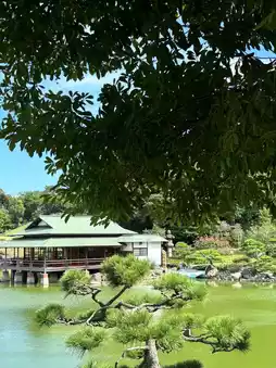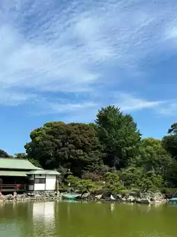 The garden features winding paths around koi-filled ponds, stone bridges, and islands, all framed by meticulously maintained trees and shrubs. The balance of water, rocks, and greenery creates a peaceful and contemplative atmosphere, ideal for strolling, photography, or quiet reflection. Seasonal changes, including cherry blossoms in spring and vibrant autumn foliage, enhance its scenic beauty.