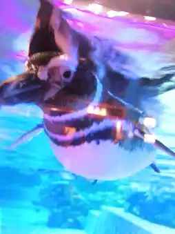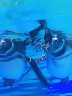 The tank's design allows visitors to view the penguins from both above and below, allowing them to enjoy both their gliding underwater movements and their waddling on land.