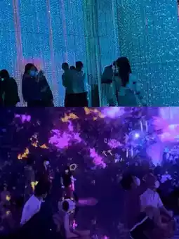 Next is TeamLab, one of Tokyo's hottest spots these days. ✨ This digital art exhibition allows you to experience art with your entire body. The space is filled with a mesmerizing display of lights and colors that seem to come alive, making it a perfect place for photography 📸. Highlights include an area where you feel like you're walking on water and an endless field of blooming flowers in media art—experiences that are truly breathtaking in person.