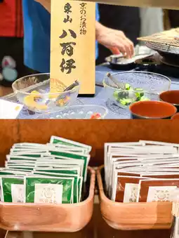 We stock rice from Kyoto's long-established rice shop, "Yadaime Gihee," pickles from "Higashiyama Yaoi," coffee from "Ogawa Coffee," and tea from "Kyoto Tsujiri," among other famous Kyoto shops.