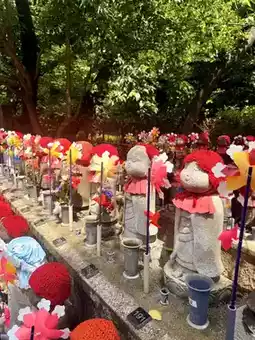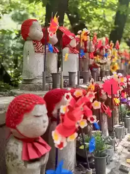 At Zojoji Temple, it's easy to snap a photo with Tokyo Tower. It's also a popular temple for broadcasting the bell-ringing ceremony after the New Year's Red and White Festival in Japan. To the right of the temple, there's a row of adorable baby Jizo statues—Chibako Jizo. These stone statues embody the parents' hope for their children's healthy growth, and parents often dress them in clothes, hats, and even place pinwheels.