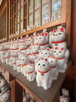 The most spectacular feature of Gotoku-ji Temple is the Maneki Nekoden, which is filled with thousands of maneki Neko. Worshipers can buy a maneki Neko and, once their wishes are fulfilled, return it to the temple for worship. The temple's ema (drawn horses) and fortune-telling verses also feature maneki Neko.