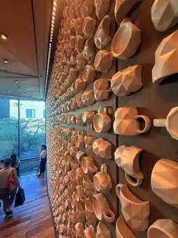 The stairwell is also a prime photo spot, with a wall made of cups creating a striking display of geometric and mathematical beauty. The third-floor outdoor area offers views of the Meguro River and the Nakameguro cityscape. Inside, a coffee bean production line and a mixology bar merge.