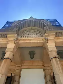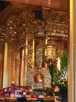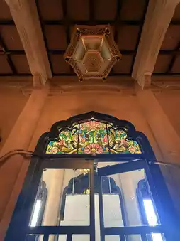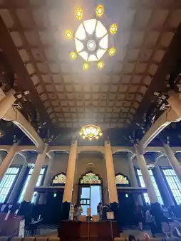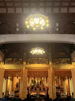 The current building, designed and built in 1934 by architect Chuta Ito, incorporates Indian and Chinese influences, resulting in an avant-garde design. The building's dome-shaped roof is shaped like a bodhi tree leaf. A lotus flower is painted in the center of the facade, and the main hall features stained glass, giving it a feel of both a church and a Buddhist temple.