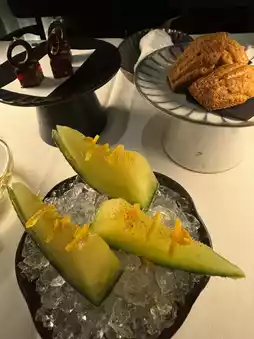 I had tea time with carrot madeleines, raspberry and hazelnut chocolate, and melon.