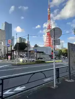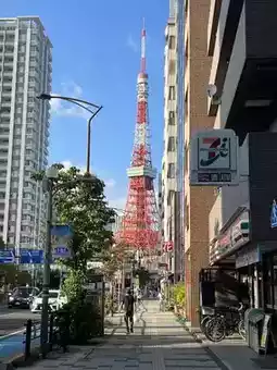From here, Tokyo Tower exudes an overwhelming presence, even though it's hidden in the everyday life of the city.