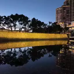 A stunning view of ginkgo trees and skyscrapers reflected in the water!