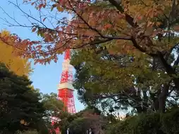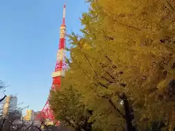 π As the sun sets, the golden leaves take on a deeper glow under the twilight, and Tokyo Tower lights up with warm yellow lights. This stunning scene is truly breathtaking!