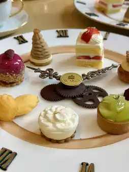 Step into timeless sophistication at WAKO Ginza Annex Tea Salon, where afternoon tea takes on a refined and artistic form. Instead of a traditional stand, the desserts are beautifully arranged on a clock-inspired plate, symbolizing an elegant “tea time.”