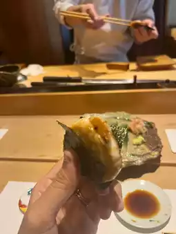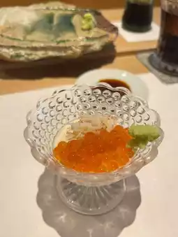• Ingredients are meticulously selected, with the chef personally visiting Toyosu Fish Market to ensure maximum freshness. The chef uses pairing techniques such as wasabi, soy sauce, salt, or grated lemon to elevate the flavor of each nigiri.