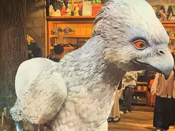 • The shop covers approximately 900 square meters and spans two floors. It's decorated with a magnificent "Forbidden Forest" theme, complete with artificial trees and magical lanterns. And there's a statue of Buckbeak the Hippogriff for you to take photos with.