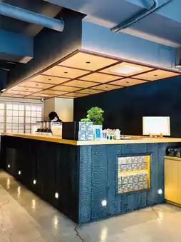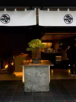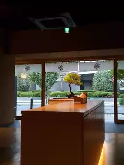 • The interior is decorated with wood. Natural materials and a 200-year-old bonsai tree are used as decorative elements, creating a sense of calm in the midst of a bustling city.