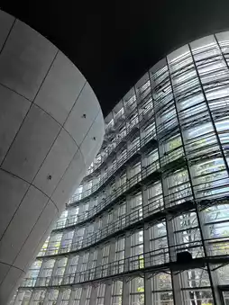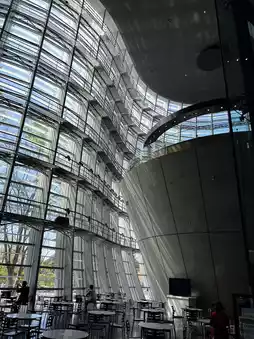 The building's giant curved glass ripples beautifully reflect light. The interior is airy, clean, and filled with natural light.