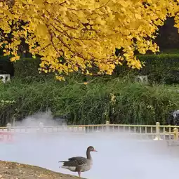 · Experience the autumnal spirit as you walk through the fallen leaves on a park path