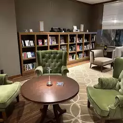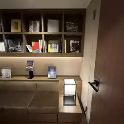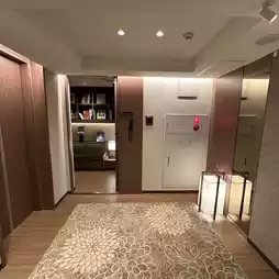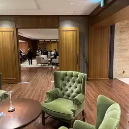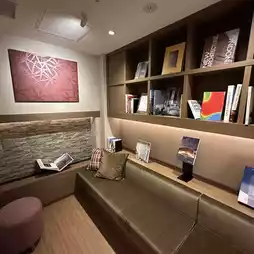 This is Shiba Park Hotel, located in the Shiba area of Minato Ward, Tokyo. The distinctive feature of this hotel is the large bookshelf right at the entrance. It's a photogenic spot. The atmosphere around the front desk is very calm, and there are several tables where you can chat. There is a coffee machine next to the front desk, so you can drink coffee and tea freely.