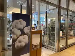 The cafe's food and drink booths are set up inside and outside the store with tables and sofas.