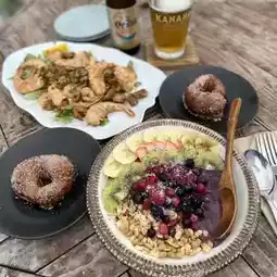 Freshly fried malasadas and fruit-filled acai bowls. 🍇🍌🥝✨