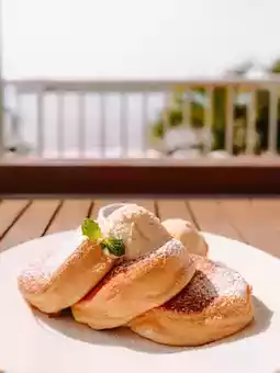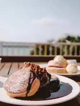Enjoying pancakes while gazing at the blue sky and ocean truly feels blissful!