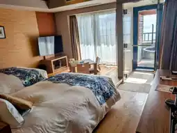 We stayed in a 28-square-meter double room with an airport view. It had wooden floors, a small sofa area, and a balcony with an ocean view. We also had free access to the VIP lounge. A night for two, including breakfast, cost NT$6,600. While a bit more expensive than the resort hotel next door, it offered a hot spring bath.