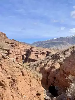 Reaching the top of Kok Moynok Canyon in Kyrgyzstan as a tourist is an unforgettable moment. From this vantage point, the canyon’s stunning rock formations stretch out below, their deep red and orange hues glowing in the sunlight, shaped into dramatic ridges and smooth, almost sculpted curves. Beyond the rugged canyon walls, the vast Kyrgyz landscape unfolds—rolling hills, open plains, and, in the distance, the breathtaking sight of snow-capped mountains standing against the clear blue sky. The contrast between the arid canyon and the icy peaks is mesmerizing, making the climb entirely worth it for the awe-inspiring panoramic view.