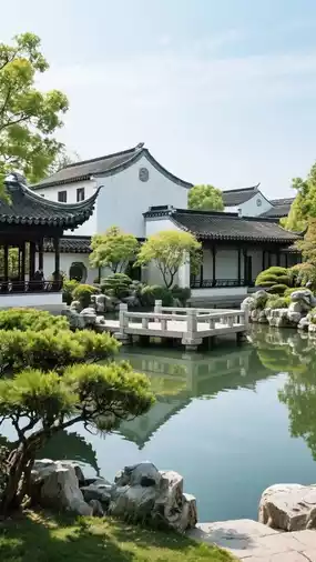 Huizhou Garden Morning Light: light mist, white walls reflected like a painting, extremely photogenic;