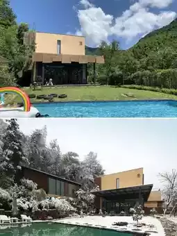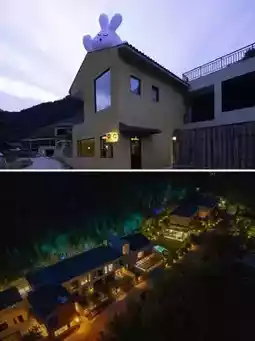 The B&B is built on a mountain and combines modern and rural styles. The square floor-to-ceiling windows bring the beauty of nature into every corner.