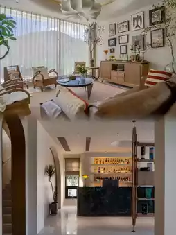 There's a courtyard pool, framed by the building's curved columns, creating a natural photo spot. There's also a restaurant, café, bar, and a 2000-square-meter grassy field where you can run and play to your heart's content.