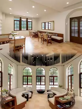 The semi-outdoor heated pool is suitable for year-round use, with underwater lighting resembling a starry sky at night. The library houses French literature and art books, along with a vinyl record player and classic chanson albums. There's also a children's play area and a petting zoo.