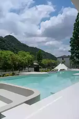 ▫️ Floor-to-ceiling windows frame heart-stopping views of OMG Heartbeat Park, with the pool mirroring mountain peaks 🌊