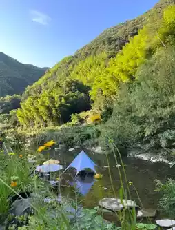 Ice-cold stream water 🍉, sitting in water while dining/drinking!
