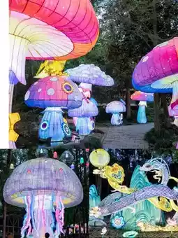 A summer-exclusive event 🌞, the lanterns usually light up around 7 PM and last until 10 PM. As night falls, Yaolin Fairyland transforms into a sea of lights 🌊. Lantern displays feature quirky yet adorable mythological figures 😜, lifelike prehistoric creatures 🦖, and a futuristic, mysterious "Spaceport" installation 🛸.