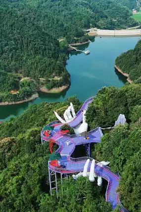Two huge hands hold up a purple plank road, as if walking on clouds. Nearby is a shouting spring where you can shout loudly and watch the water rise and fall with your voiceâvery fun.