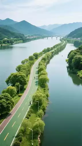 - ✅ Fuchun River runs through the entire area: clear blue water, green mountains on both sides like ink wash, boats drifting like poetry