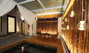 ✔️ Private Hot Spring: Japanese garden style, with bamboo curtains and lantern ambiance