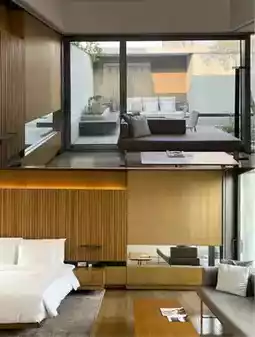 The guest room has a small courtyard. My daughter said it feels like home. The interior is decorated in wood and white, which is clean and refreshing.
